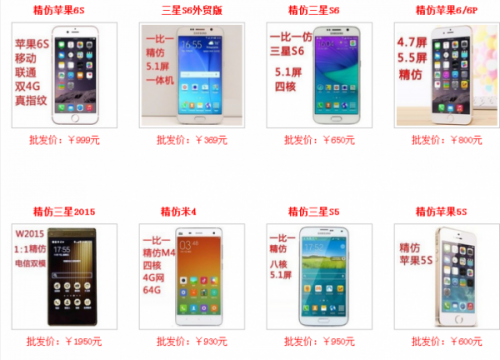 前文提到的阿河,现在经营一家线上的高仿手机批发店,最新版的iPhone6s ,在他那里卖999元,三星S6则卖650元,手机批发5部起卖,先付款后发货,一年保修,今年7、8月份,他大概做了1000多笔交易,算下来,至少也有五千部手机的量。