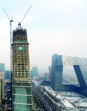 昨天上午,随着最后一根9米长钢梁缓缓从地面升起并准确吊装就位,高达295米的国贸三期B座工程实现主体结构封顶。明年10月,位于国贸桥西北角的国贸三期B座将完工,它建成后将与目前“北京第一高”的国贸大厦组成“国贸双璧”,届时,国贸的各个项目之间将会在空中和地下通过空中连廊和地下走廊相连。