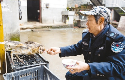 “小天鹅”护鸟协会会长曹意助为两只猴面鹰喂食。