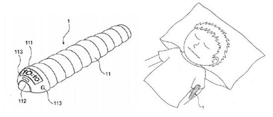 “可移动爬行的闹钟”这项专利内容中,叫人起床的方法可真是绝了!它是一个长相如毛毛虫外观的闹钟,配备人体温度感测设备,到了该起床的时刻,它就会朝你所在的地方前进,然后在你身上爬来爬去,并且同时发出叫声。把它关闭的方法是得抓住它,让它动弹不得。这个毛毛虫闹钟除了从听觉上着手外,更外加了触觉方式,来唤醒你这个赖床鬼。