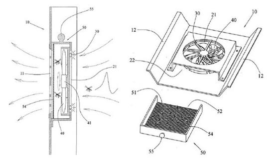 “具捕蚊功能的笔记本电脑散热座”这项专利提到的散热座,其外观、功能与一般的笔电散热座没甚么不同,差异在于当不使用笔记本电脑时,可把这个散热座立起来,其所配备的LED光源设备便会将吸引蚊子过来,当蚊子靠近时,风扇会强力运转,产生气旋将蚊子吸进去,把蚊子困在集中盒里面,然后慢慢被风干。
