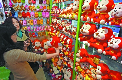 1月3日,一位客商在义乌中国小商品城拍摄“金猴”样品。新华社发