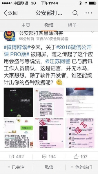 昨晚10点15分,泉州网警巡查执法发布微博称,经与广州、深圳网安部门联系,“2016微信公开课PRO版”,链接指向为腾讯公司,未发现病毒。
