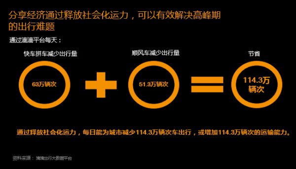 《报告》认为,分享经济通过释放社会化运力,可以缓解高峰期的出行难题。滴滴平台数据显示,仅快车拼车和顺风车两个产品,每日就能为城市减少114万辆车出行,增加114万辆次的运输能力。
