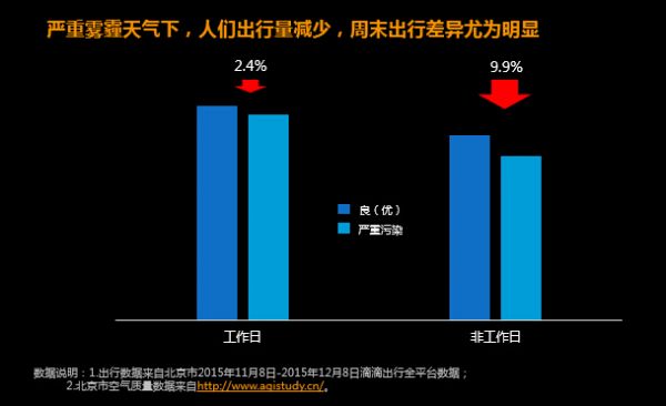 比如雾霾天不仅影响身体健康,也使人们出行量骤减,其中周末尤为明显。据北京市2015年11月8日—12月8日这一个月滴滴出行数据显示,工作日期间,空气质量严重污染时出行需求量比优良情况下降低2.4%,非工作日则降低9.9%。