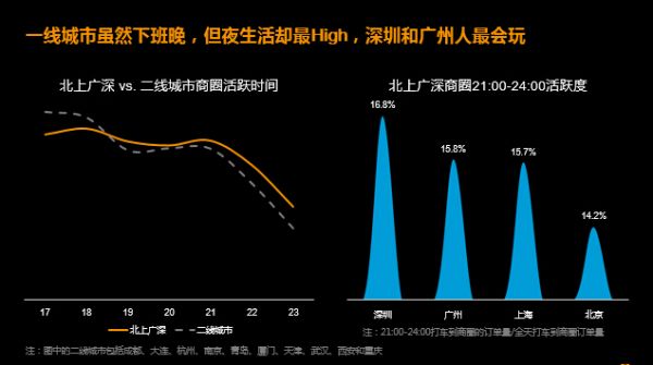 北上广深商圈21:00-24:00的活跃度(打车到商圈的订单量/全天打车到商圈订单量)分别为16.8%、15.8%、15.7%和14.2%,总体来看南方城市人群比北方的爱玩。