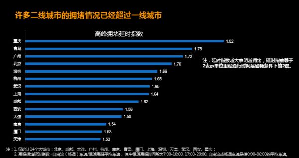 这个指标被称为高峰拥堵延时指数,越大表明越拥堵,如等于2表示同里程通行时间是通畅时2倍。青岛、广州、北京、深圳、杭州及被指因“满城挖”导致拥堵的武汉在此项排名2—7,指数分别是1.75、1.72、1.70、1.66、1.65、1.65。