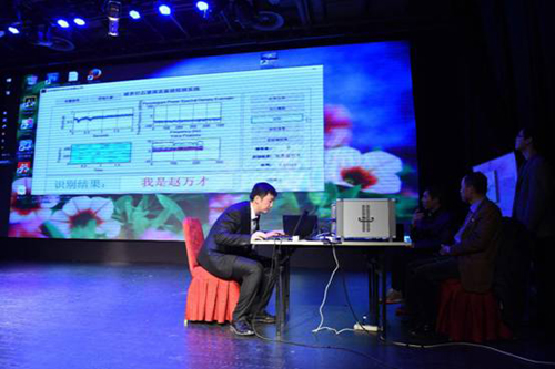 当天的发布会现场演示了聋哑人“说话”系统。一位来自北京丰台区的听力障碍者,通过电脑转换发出“大家好”等语句。据了解,这一技术是通过探测到其口腔湿度细微的变化,将湿度频率数据转换成语言信息,借助音响设备发声,帮助听力障碍者用常人的声音表达自己。