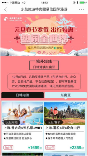 日前,东航就携手移动社交APP易信,强强联合上线了关于元旦春节寒假出行的优惠活动,自12月6日起,凡购买东航电商境外产品(包括自由行、小众游、目的地产品,不含动态机酒)的用户,即可享受易信200分钟免费国际漫游通话时长服务。易信国际漫游服务是专门针对出境游人群推出的一项特色服务功能。只要手机处于网络状态下,即可通过易信通讯软件免费拨打国内三大运营商的任意移动电话和普通固话,且无需对方安装易信APP。