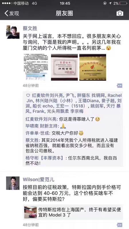 随后,蔡文胜在本人的朋友圈中表示,自己在厦门缴纳的个人所得税一直名列前茅,反击鼎麟股东对其骗税的说法。