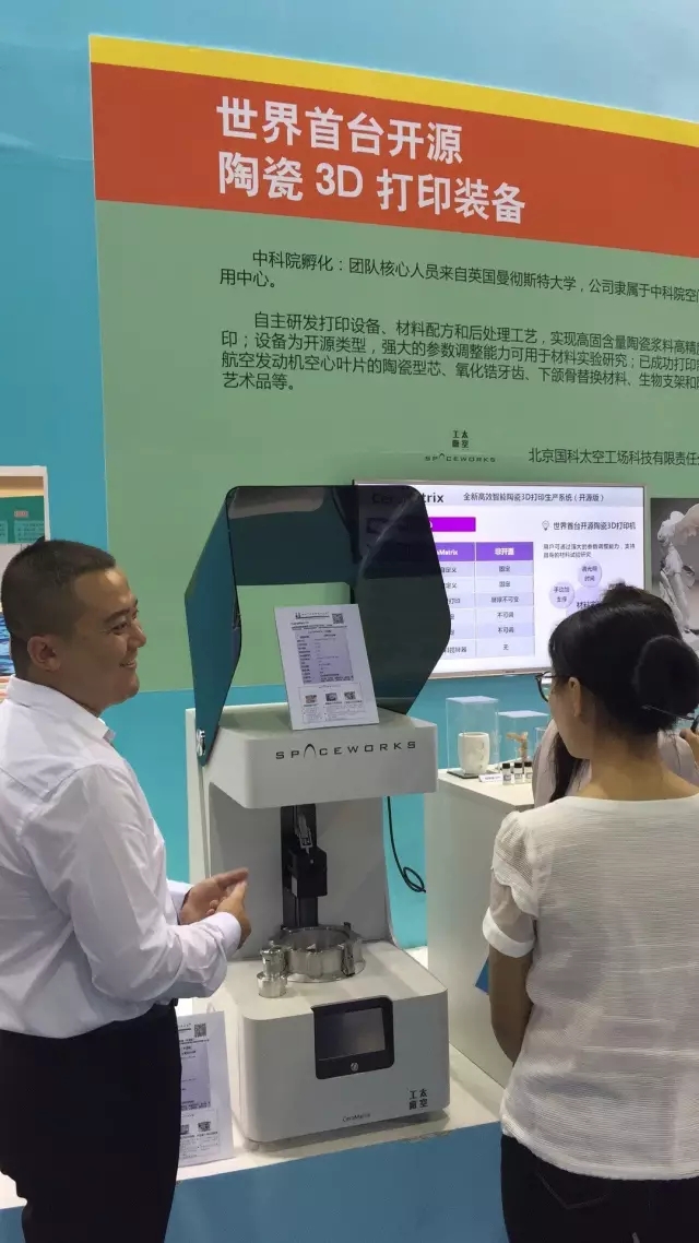 3D打印的效果令人叹为观止,在北京国科太空工场科技有限责任公司的展台,可以看到世界首台开源陶瓷 3D 打印装备。这款自主研发的打印设备通过材料配方和后处理工艺,可实现高固含量陶瓷浆料高精度打印。目前已成功打印制造航空发动机空心叶片的陶瓷型芯、氧化锆牙齿、下颌骨替换材料、生物支架和陶瓷艺术品等。