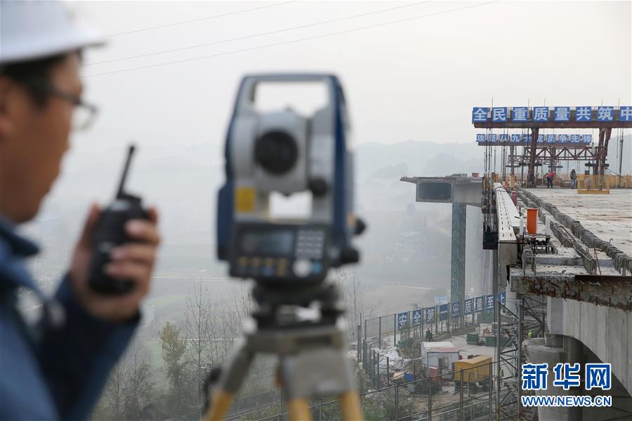 11月7日,在汉十高铁三墩转体桥施工现场,技术人员校对转体对接数据。