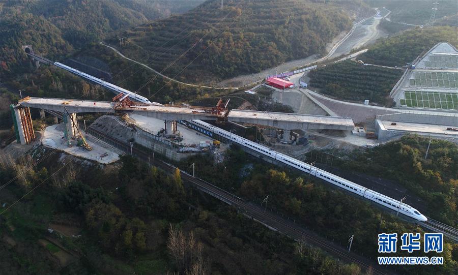11月7日,一列动车通过转体对接完成后的汉十高铁三墩转体桥施工现场。
