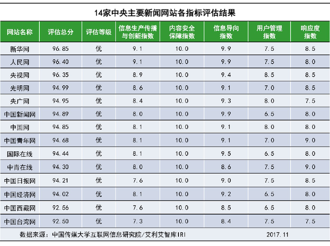 中央主要新闻网站总体表现优,新华网、人民网、央视网分列三甲,14家中央主要新闻网站评估结果具体情况如下: