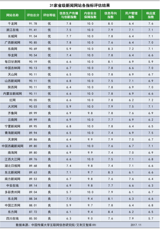 31家省级新闻网站中,14家生态表现优,17家表现良,其中,千龙网、浙江在线、长城网排名前列,网站评估结果具体情况如下: