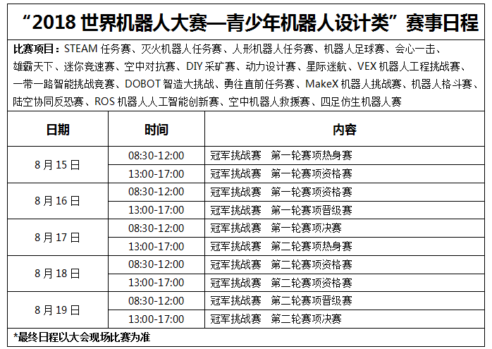 本项赛事基于机器人技术未来发展方向下设对抗类、编程设计类、创新创意类等二十余个项赛事项目,集科技性、科普性、趣味性于一体,通过专业的赛事项目激发广大青少年自主创新的热情,对机器人的兴趣,并培养青少年团队协作、策略分工、手脑协作以及临场应变的综合能力,从而推动青少年科技创新教育的普及。