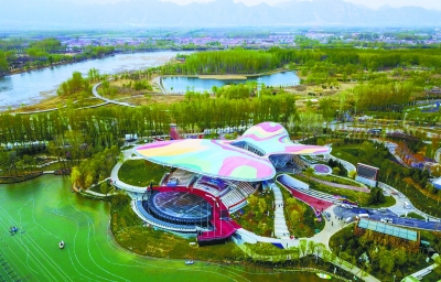 妫汭湖畔,作为演艺广场的妫汭剧场,“蝴蝶展翅”造型艳惊四座。从空中俯瞰,绚丽多彩的屋面如同穿花而过、舞动翩跹的彩蝶。施工方北京建工集团世园会妫汭剧场项目负责人刘长宝介绍,妫汭剧场建筑面积4500平方米,安装总用钢量1182吨,钢结构屋面由26榀伞状排布的悬挑钢桁架支撑,在拉索钢绞线的张拉下呈现出“蝴蝶展翅”的造型。