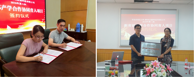 图 1-编程猫与深圳大学(左)、华东师范大学(右)举办产学合作签约授牌仪式