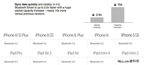 苹果上个月发布iPhone 6S、iPad Pro和iPad mini 4时,曾宣布这些新款设备将支持蓝牙4.2技术。另外,苹果的产品对比图表也显示,蓝牙4.2有望在旧款设备上激活