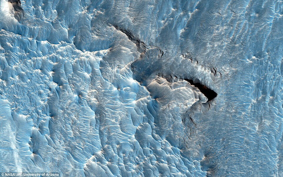 这些壮观的“冰”景,是地球上的冰雕,还是火星历史上“水”的侵蚀之作?答案:火星。 这张图片是由火星勘测轨道飞行器拍下的火星表面。地貌上的一些形状是流体由北向南移动时侵蚀形成的。