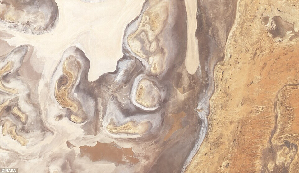 这些浅褐色的图样,是地球上的干涸大地,还是木星上的风暴肆虐?答案:地球。这是由地球观测-1号卫星拍下的位于澳大利亚中部的弗罗姆湖。图像中,这个咸水湖极其干涸,布满了白色的沉淀物。