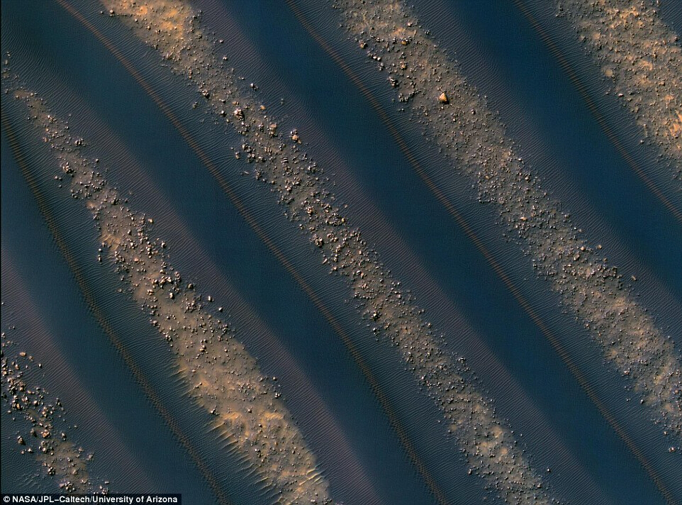 图中的景象是一年中气候变化导致的。这个景象是火星还是地球上的?答案:火星。这张图像是由火星勘测轨道飞行器拍下的。展示了许多砂砾大小的物质积淀在火星撞击坑的景象,而且这些物质的移动方向一致。