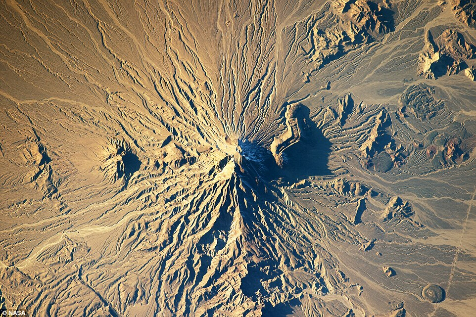 图中区域被隧道断开,并从一个最高点向下延伸。这是一个奇特的世界还是地球上的景象? 答案:地球。图中战士的Bazman火山,位于伊朗南部的偏远地区。这座火山除了典型的成层火山的圆锥形状,也被隧道切断,从一个顶点向下延伸。