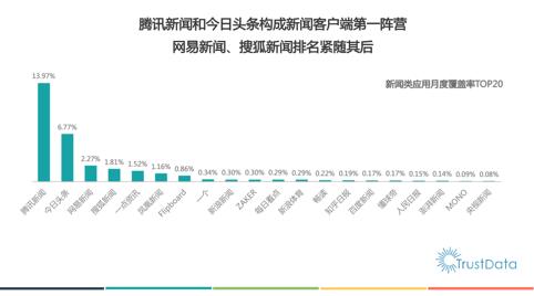 月度覆盖率排行榜上,腾讯新闻以13.97%的成绩位列同类应用首位,今日头条以6.77%的成绩排名第二,和腾讯新闻共同构成新闻资讯客户端的第一阵营。网易新闻、搜狐新闻紧随其后,月度覆盖率分别为2.27%、1.81%。