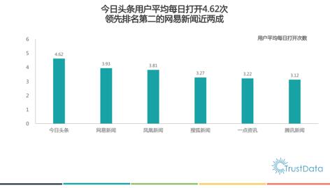 在用户平均每日打开次数方面,依旧是今日头条、网易新闻、凤凰新闻包揽前三名。今日头条用户平均每日打开次数为4.62次,网易新闻为3.93次,前者领先后者近两成。排名第三的凤凰新闻用户平均每日打开3.81次。