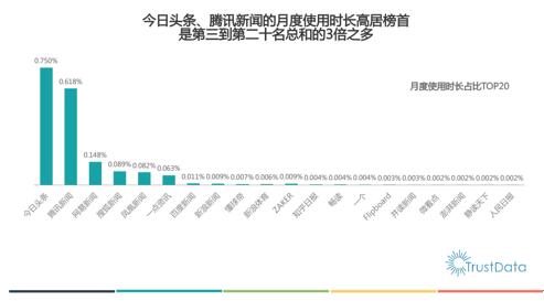 新闻资讯客户端月度使用时长占比TOP20排行榜中,今日头条位于同类APP第一名,月度使用时长占比为0.750%。腾讯新闻以0.618%的成绩位于第二名。排名第三、四、五名的网易新闻、搜狐新闻、凤凰新闻成绩较为接近,分别是0.148%、0.089%和0.082%。