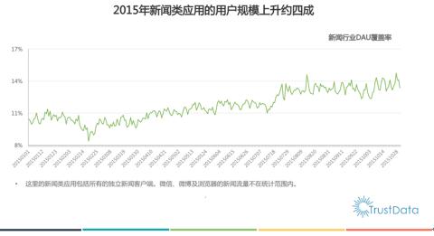 报告显示,从2015年1月至10月,中国新闻资讯APP日活跃用户覆盖率从不到11%上涨至约14%,用户规模扩大约四成。
