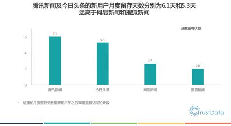 腾讯新闻的新用户月度留存天数为6.1天,即新用户在之后30天里重复访问天数为6.1天。今日头条为5.3天。在该数据维度上,两款APP差距较小。排名其后的网易新闻新用户月度留存天数为2.7天,搜狐新闻则为2.0天。
