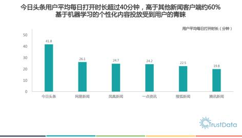 在用户平均每日打开时长方面,今日头条、网易新闻、凤凰新闻位列同类应用前三名。今日头条用户平均每日打开时长为41.8分钟,网易新闻为26.1分钟,凤凰新闻为24.7分钟。网易新闻、凤凰新闻与今日头条之间差距明显。