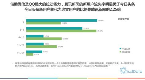 但今日头条新用户转化为忠实用户的比例是腾讯新闻的2.25倍。当新用户月度留存天数为21-30天时,该用户被认定为忠实用户。在月度留存天数21-30的数据维度上,今日头条的月度留存率为9.05%,腾讯新闻为4.01%。