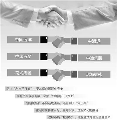《关于深化国有企业改革的指导意见》提出,“鼓励国有企业之间以及与其他所有制企业以资本为纽带,强强联合、优势互补,加快培育一批具有世界一流水平的跨国公司”,同时明确要“清理退出一批、重组整合一批、创新发展一批国有企业”。