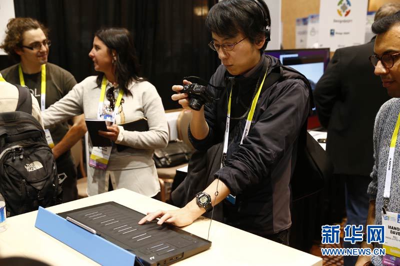 一名记者在体验一款音乐键盘外设。当地时间1月5日,2016拉斯维加斯消费电子展举行媒体预展,多家企业携新品亮相。新华网发