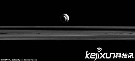 美国宇航局最新发布图像呈现土星卫星完美地排列在一起,如图所示,在土星环之上土卫二和土卫三排列成一线,体积较小的土卫二位于前景。