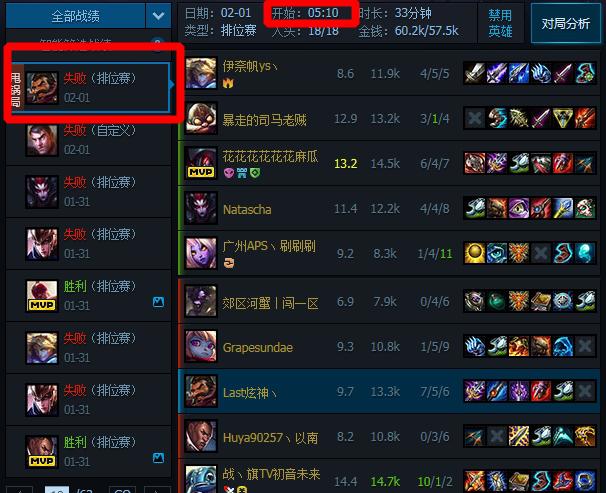 这位大神估计也是有备而来的,他于2月1日凌晨5点10分就开始了定位赛,第一局就遇到了OMG现任ADC司马老贼的出名英雄飞机,使用的当前热门的打野男枪,虽然没坑但也没carry,第一局就跪了。