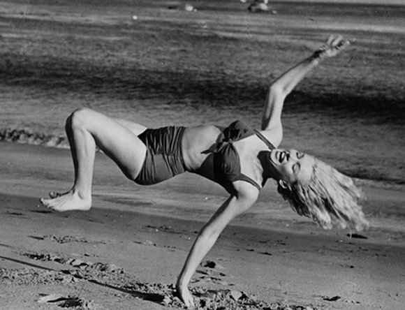 在影片拍摄间隙,玛丽莲·梦露在自己位于好莱坞的住所附近的一片沙滩上嬉戏。大约摄于1950年