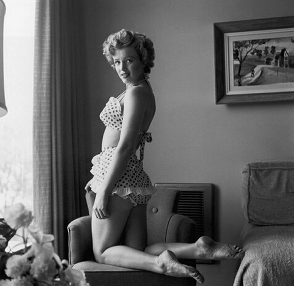 玛丽莲·梦露身穿泳衣,跪在一张椅子上。大约摄于1951年