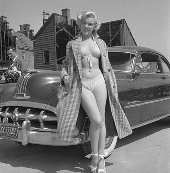 1951年,玛丽莲·梦露在福克斯公司位于洛杉矶的外景场地拍摄肖像照,她站在了一辆1950年的庞蒂亚克酋长轿车旁边