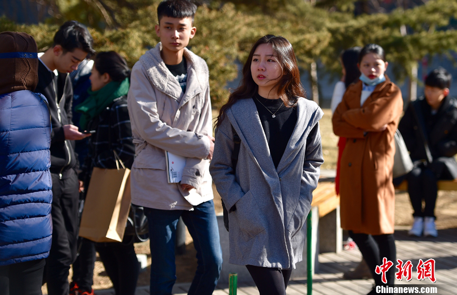 2016年2月15日,北京电影学院2016年艺考初试开始,考场外帅哥美女云集。新一代的“女神”“小鲜肉”遍布校园各处。不少考生就顶着寒风提前在各个教学楼外排队,为上午的考试做准备。其中表演学院的考生仍然最受关注。今年考生的整体颜值颇高,几乎没有顶着浓妆上阵的考生,大多以素颜或淡妆出镜。中新网记者 金硕 摄