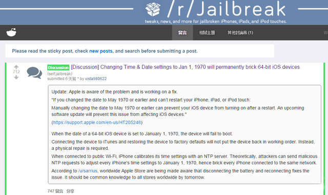 一个名为vista980622的网友在国外网站Reddit的论坛上发表了一篇“把iPhone时间改成1970年1月1日,手机即可永远变砖”的帖子。