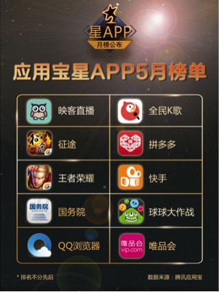 在应用宝“星APP榜”5月月榜中,映客直播、拼多多、全民K歌、征途、王者荣耀、球球大作战、QQ浏览器、国务院、快手、唯品会等10款APP脱颖而出。其中,具备UGC功能的APP在本期榜单中最为抢眼,映客直播、全民K歌、快手3款APP扛起UGC大旗,成为移动互联网市场的最新宠儿。
