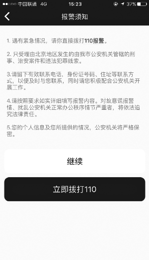 2 在注册成功后进入报警界面,弹出“报警须知”,点击“继续”,进入报警主页面,就可以报警了。