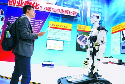 昨天,“双创周”北京会场主题展现场,一位观众与自动拣选物品的智能机器人对视。记者 和冠欣摄