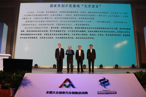 海淀区委书记崔述强代表4家双创示范基地宣读双创宣言:努力培育、宣传双创文化,使创业创新成为全社会共同的价值追求和行为习惯,推动形成鼓励创新、宽容失败的双创生态环境;努力弘扬诚实守信、公平竞争的双创精神,在创业创新活动中坚守社会责任,共同树立信用自律的道德观念和行为准则;不断完善多层次双创支撑体系,让更多的人敢创业、能创业、会创业;努力构建政策协同、资源集聚和开放共享的新格局,为实现大众创业、万众创新的各项目标,做出我们应有的贡献。