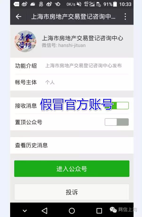 经向有关部门核实,上海市住建委及下属的上海市房地产交易中心,从未注册过“上海市房地产交易登记咨询中心”的微信公众号,也未授权该微信公众号发布过任何信息。经核查,该微信公众账号为个人注册,存在假冒官方账号发布虚假信息的行为,极易误导公众,造成不良社会影响。