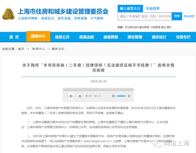 日前,上海市住建委也通过官网回应此消息:此为不实信息,近期未出台过关于存量房交易的新规。