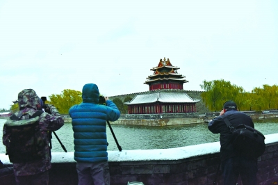 昨天,北京迎来今年入冬第一场雪,故宫角楼披上白衣,摄影爱好者们用相机记录这难得的美景。记者 和冠欣摄
